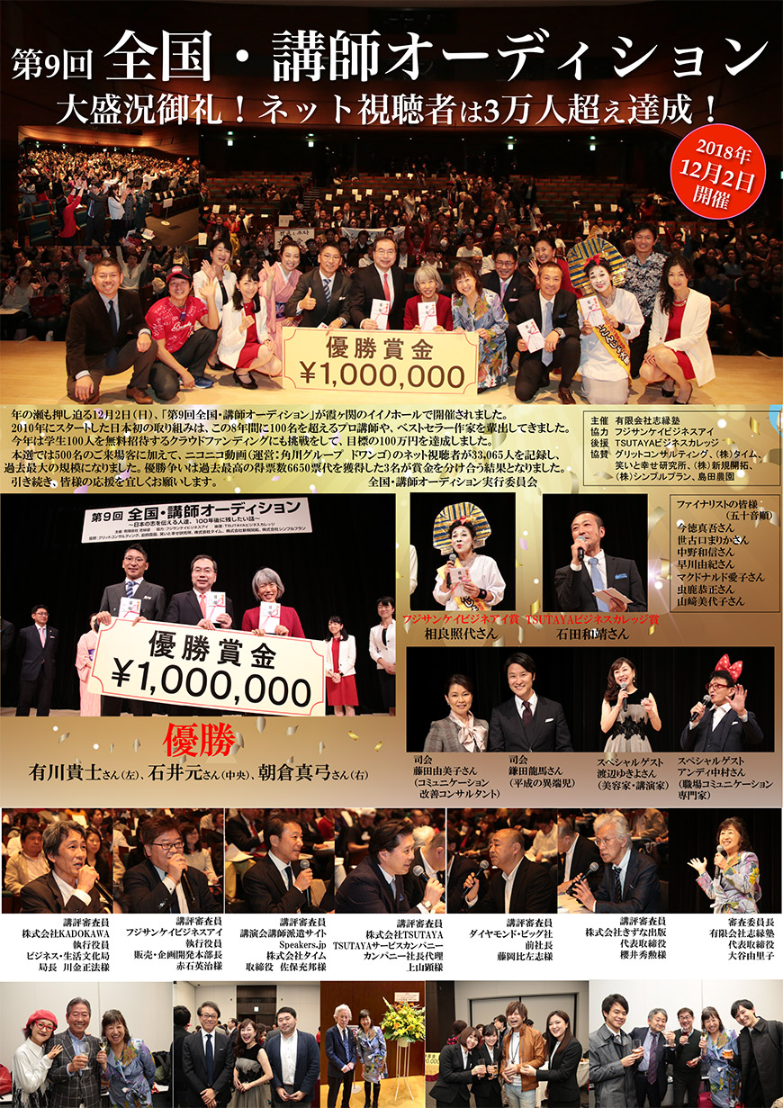 本選の写真2020年の記録 1.リハーサル 2.エントランス 3.楽屋 4.ファイナリスト 5.授賞式 本選の写真2019年の記録 1.リハーサル 2.エントランス 3.楽屋 4.会場内 5.ファイナリスト 6.大谷由里子のトークライブ 7.授賞式 8.懇親会 本選の写真2018年の記録 1.リハーサル 2.エントランス 3.楽屋 4.会場内 5.ファイナリスト 6.講評の様子 7.大谷由里子のトークライブ 8.授賞式 9.懇親会 Tweet